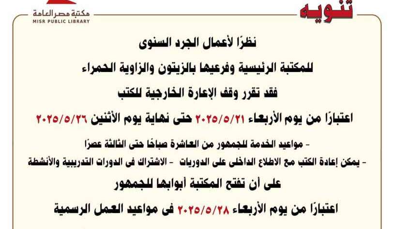 الجرد السنوي للكتب 2025 يحدث الآن بالدقي, يحدث الآن بالزاوية, يحدث الآن بالزيتون, يحدث الآن بالعمرانية 📚 تنويه هام | الجرد السنوي للكتب 2025 –تُعلن مكتبة مصر العامة…Read more