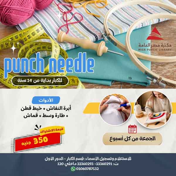 ورشة البانش نيدل (التطريز بإبرة النفاش) فن من فنون التطريز بإستخدام إبرة النفاش الى بنتعلم من خلاله إزاى ترسمى تصميمك على القماش وتقفلي شغلك صح ويطلع منتج مميز بأشكال مختلفة من ماديليات وتطريز على شنط ومعلقات ديكور ومفارش